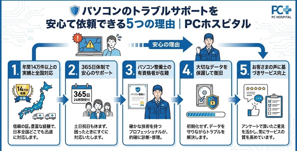 当サービスがパソコンのトラブルサポートを安心してご依頼いただける5つの理由です。
