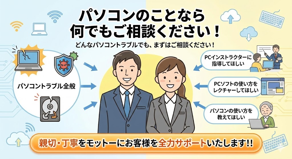 トラブル以外にも、「PCインストラクターに指導してほしい」「PCソフトの使い方をレクチャーしてほしい」「パソコンの使い方を教えてほしい」PCに関することなら何でもOKです。