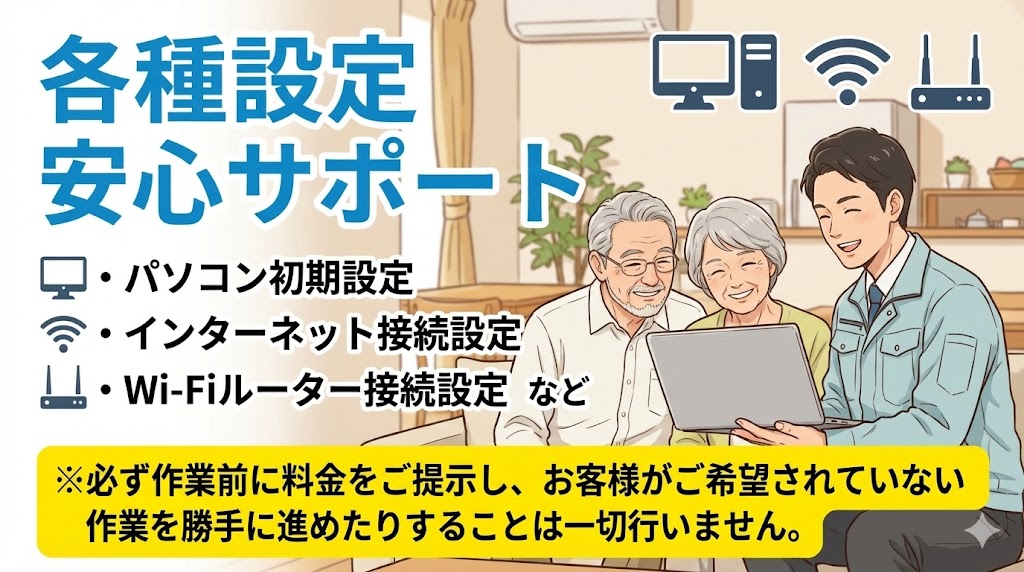 量販店でセットアップする場合は割高になりますが、当サイトでは出張費込みのパッケージメニューで、安くて安心なパソコン初期セットアップサービスを提供しています。