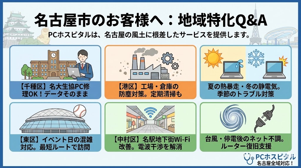 - 工場・倉庫エリア:港区や南区などの工業地域では、粉塵や湿気の影響でPCトラブルが起きやすい傾向があります。こまめなバックアップを推奨します。