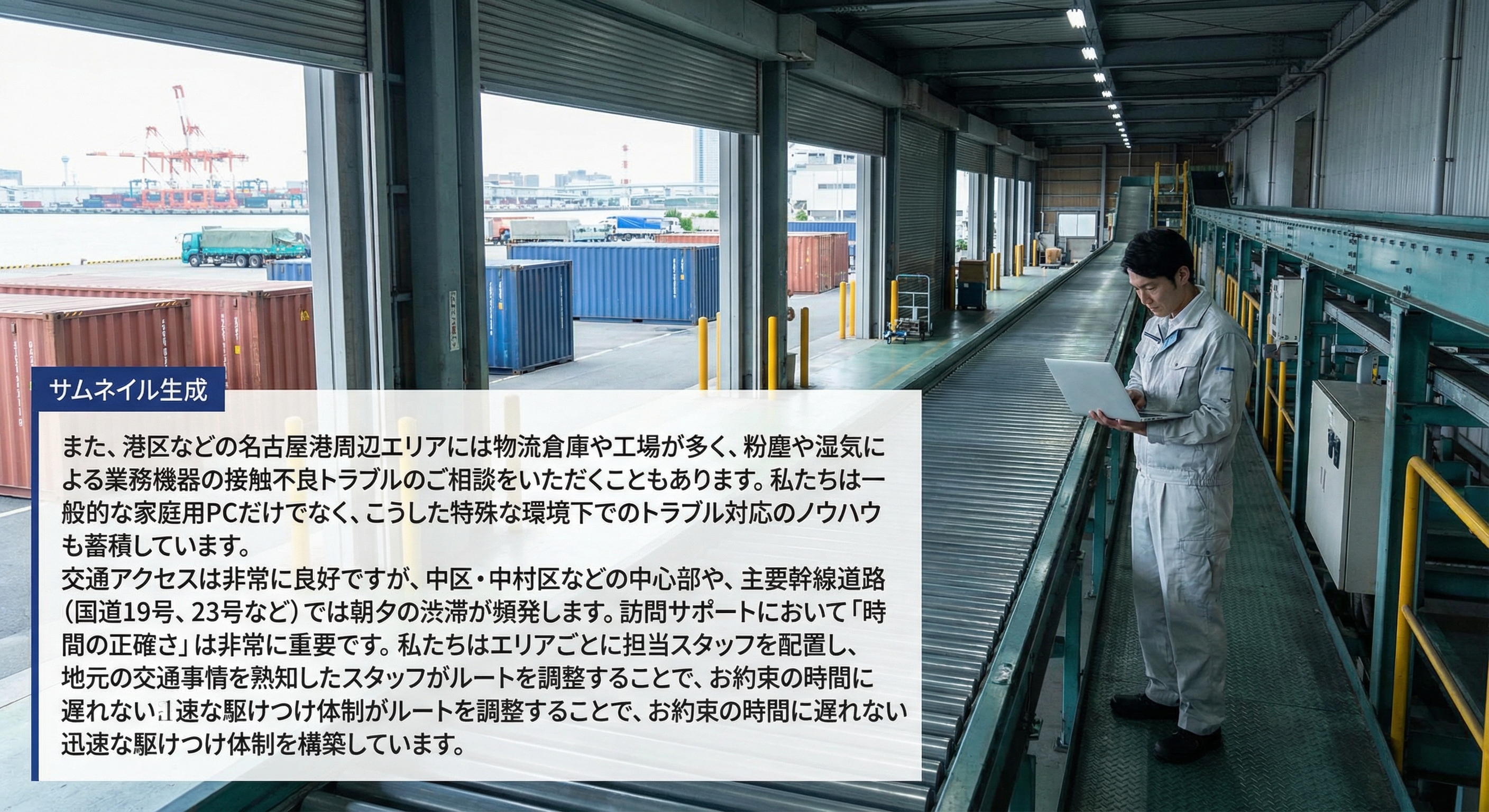 また、港区などの名古屋港周辺エリアには物流倉庫や工場が多く、粉塵や湿気による業務機器の接触不良トラブルのご相談をいただくこともあります。私たちは一般的な家庭用PCだけでなく、こうした特殊な環境下でのトラブル対応のノウハウも蓄積しています。