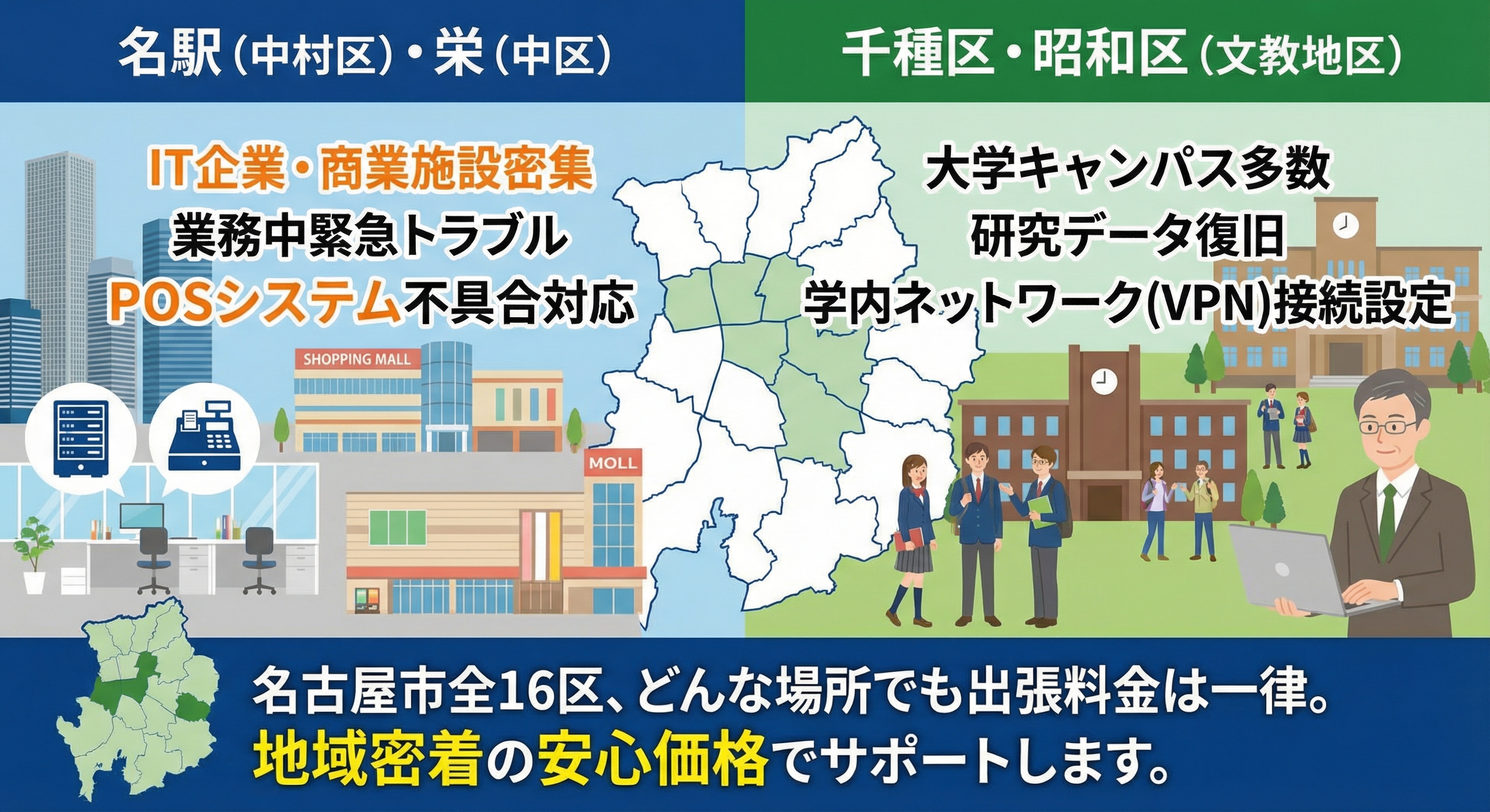 - 千種区(覚王山・星ヶ丘) — 名古屋大学・各種学校が点在。学生様の「大学指定PCのセットアップ」や、論文データの緊急復旧依頼が多い文教エリア。