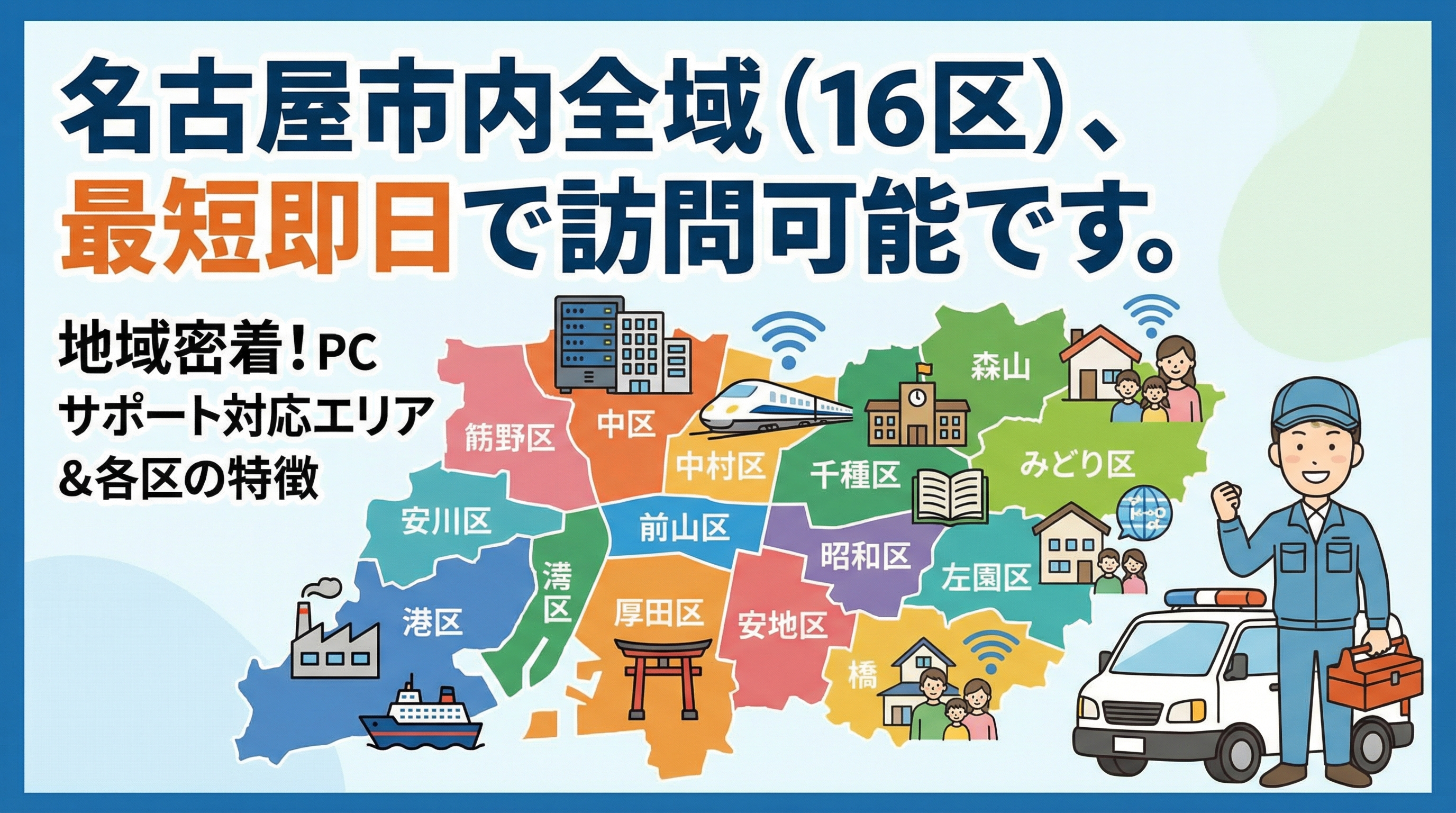 中部地方の経済・行政の中枢である名古屋市(人口約233万人)は、ビジネスと生活が密接した都市構造ゆえに、特有のパソコンサポート需要が存在します。
