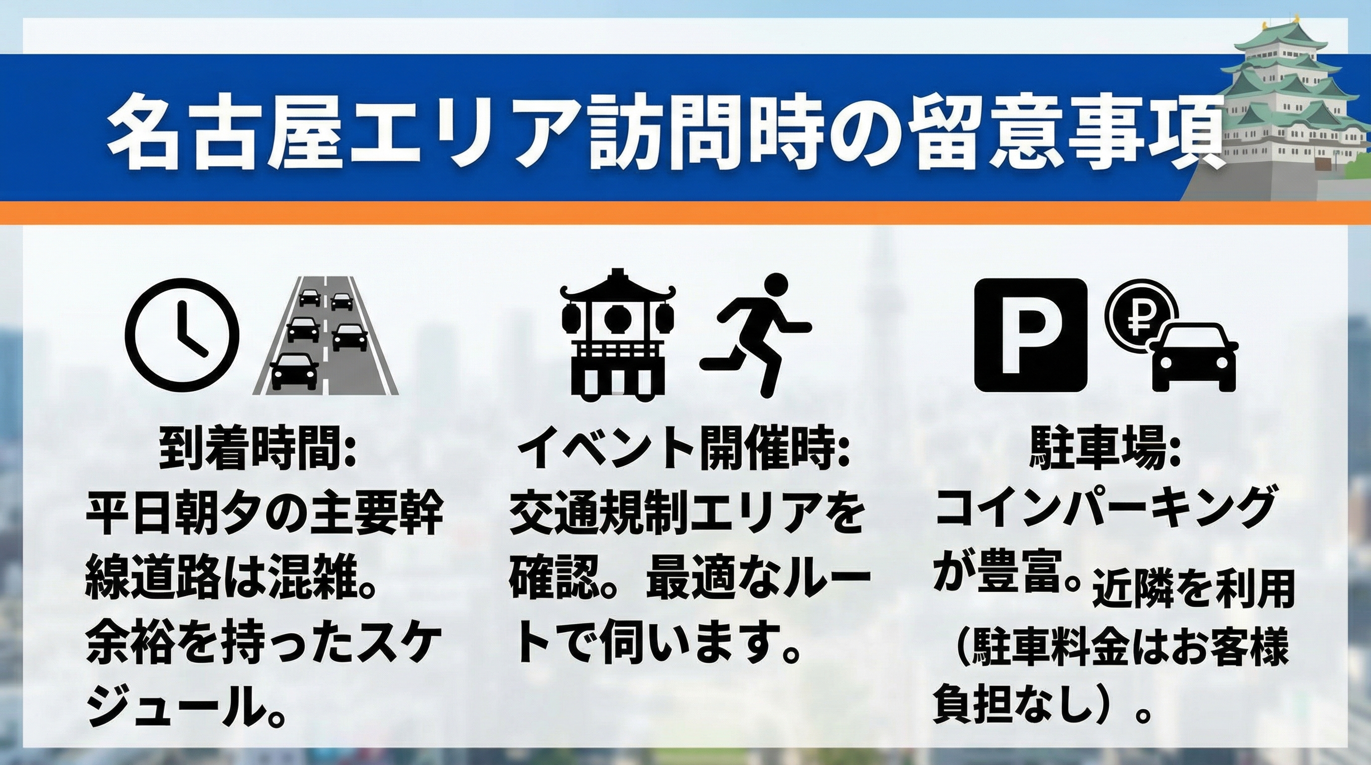 - イベント開催時:名古屋まつりやマラソン開催日は、交通規制エリアを確認の上、最適なルートで伺います。