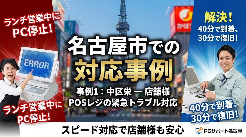 - 中区(栄・大須・金山) — 官公庁やIT企業が集中。法人様のサーバー保守や、店舗様のPOSシステム復旧依頼が多数。大須エリアの自作PCトラブルも対応。