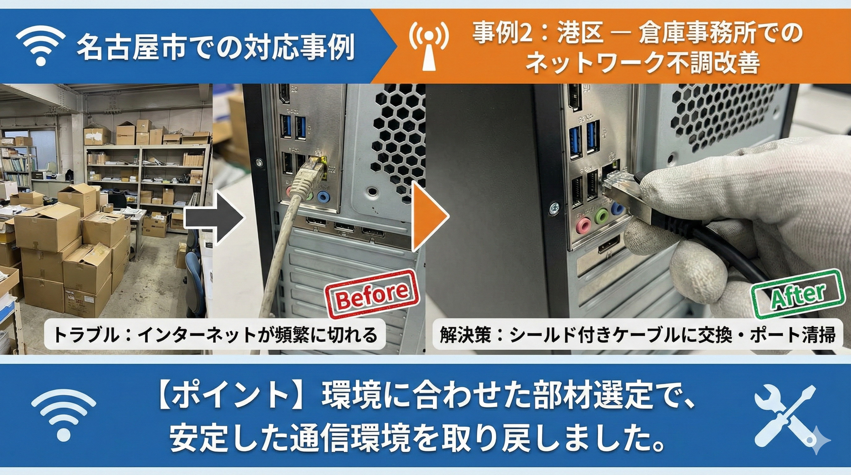 事例2:港区 — 倉庫事務所でのネットワーク不調改善