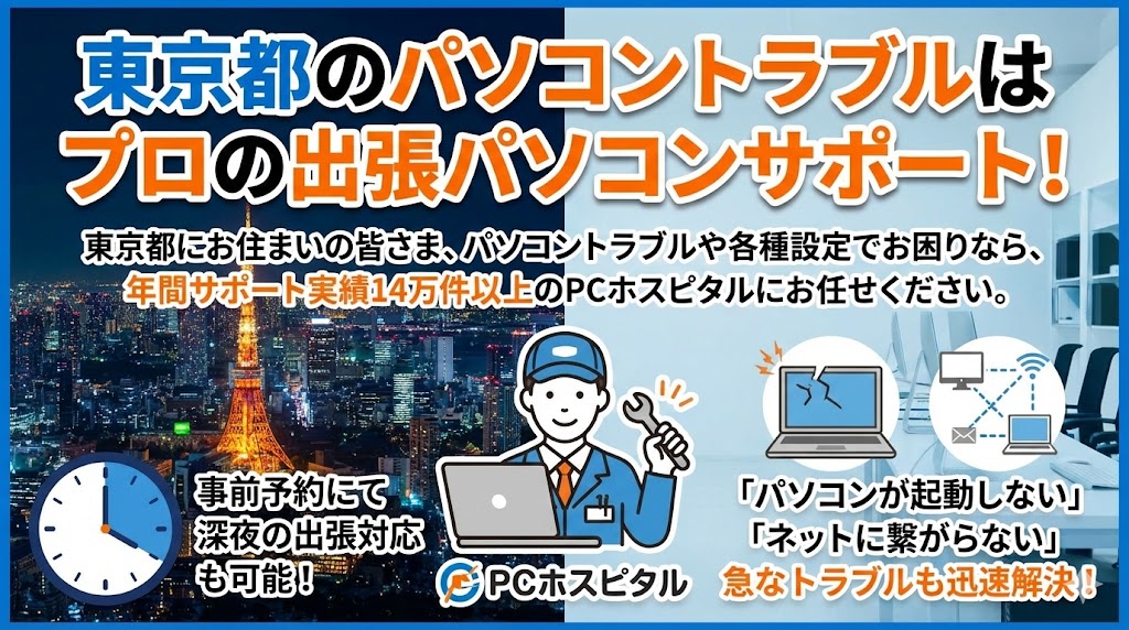 東京都内のパソコンサポートは、親切・丁寧・安心価格で解決のPCホスピタルにご依頼ください。