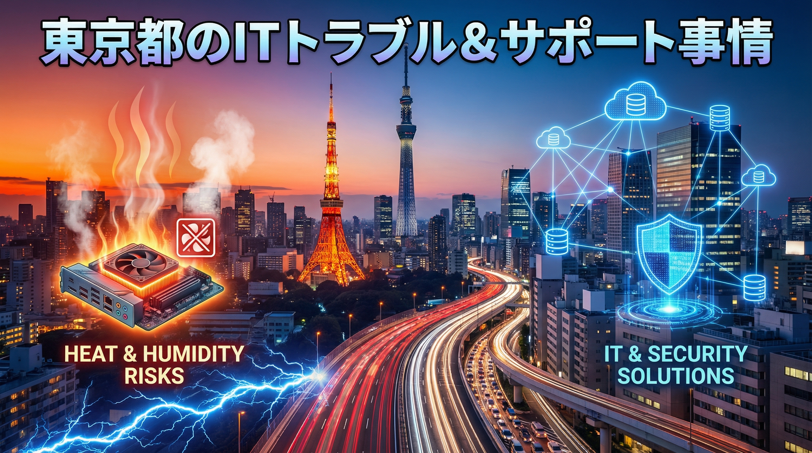 東京都は日本の首都で、人口約1400万人を擁する世界有数の大都市圏です。23区を中心とする都市部と、多摩地域・島しょ部で構成され、東西約90キロメートル、南北約25キロメートルに広がります。年間平均気温は15.8度、太平洋側気候に属し、夏季(7月~8月)は最高気温が35度を超える猛暑日が増加傾向にあり、パソコンの熱暴走や冷却ファンの劣化が頻発します。