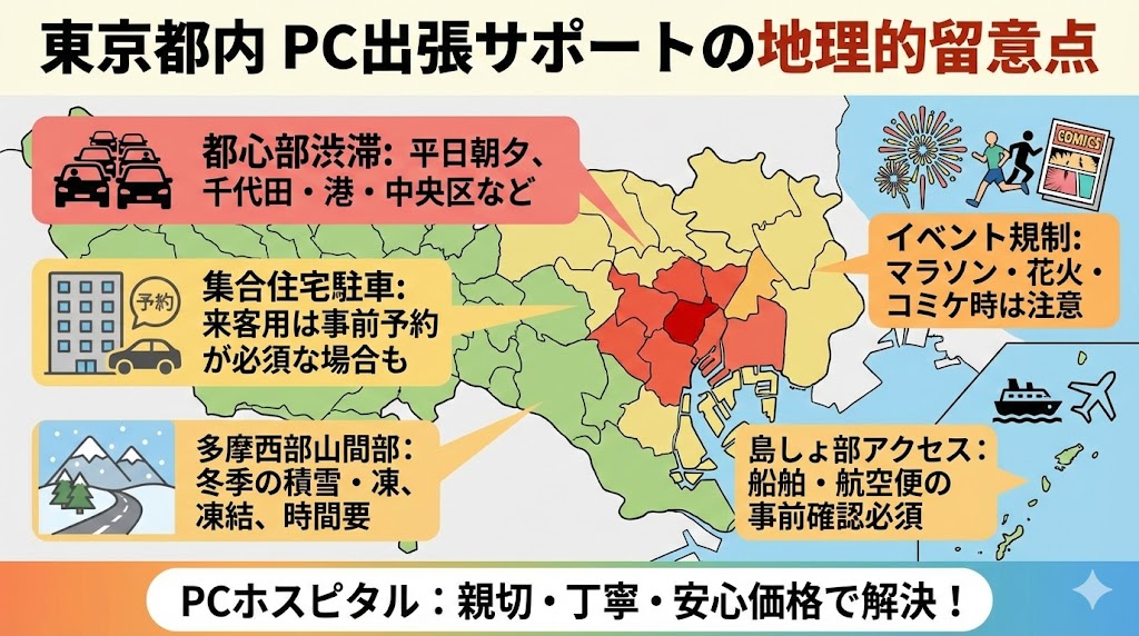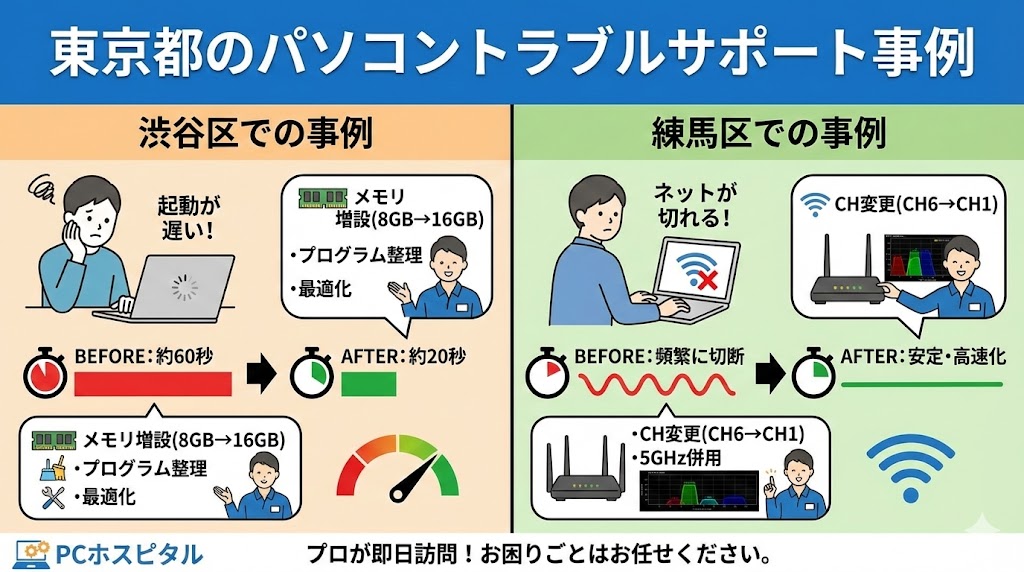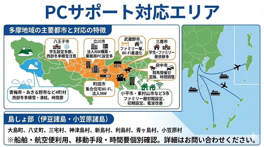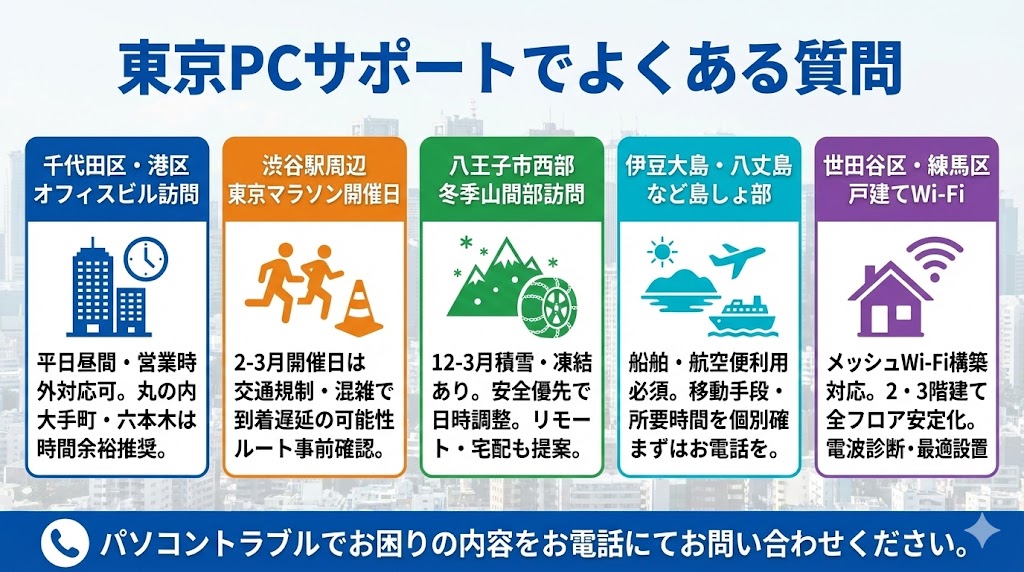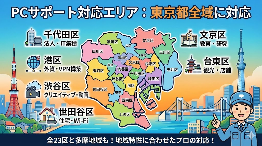 東京都では、千代田区・港区・中央区のオフィス向け法人PC設定、渋谷区・新宿区のスタートアップ企業向けクラウドサービス連携、世田谷区・練馬区のファミリー層向けメッシュWi-Fi構築、文京区・新宿区の大学周辺での学生向け初期設定など、地域特性に応じたサポートを行っております。夏季の熱対策(都心部の高層ビル)や冬季の乾燥対策(静電気防止)も考慮した環境構築が可能です。