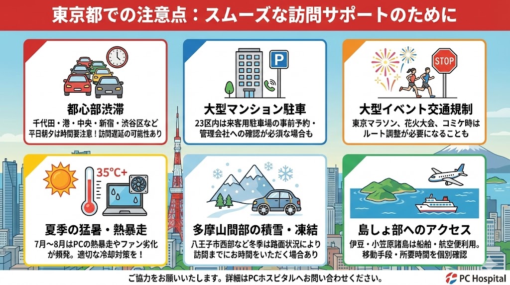 イベント面では、東京マラソン(2月~3月、参加者約3.8万人)、隅田川花火大会(7月、約100万人)、神田祭・山王祭(5月~6月)などの大規模イベント時には、都心部で交通規制が実施され、駐車スペース確保が困難になります。また、年末年始のコミックマーケット(東京ビッグサイト、約75万人)期間中は臨海部での訪問調整が必要になります。