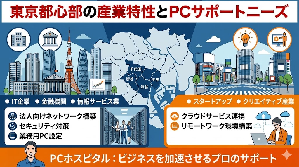 産業面では、千代田区・港区・中央区を中心にIT企業、金融機関、情報サービス業が集積しており、法人向けのネットワーク構築、セキュリティ対策、業務用PC設定のニーズが極めて高い地域です。また、渋谷区・新宿区にはスタートアップ企業やクリエイティブ産業が多く、クラウドサービス連携やリモートワーク環境構築の依頼も多数寄せられます。