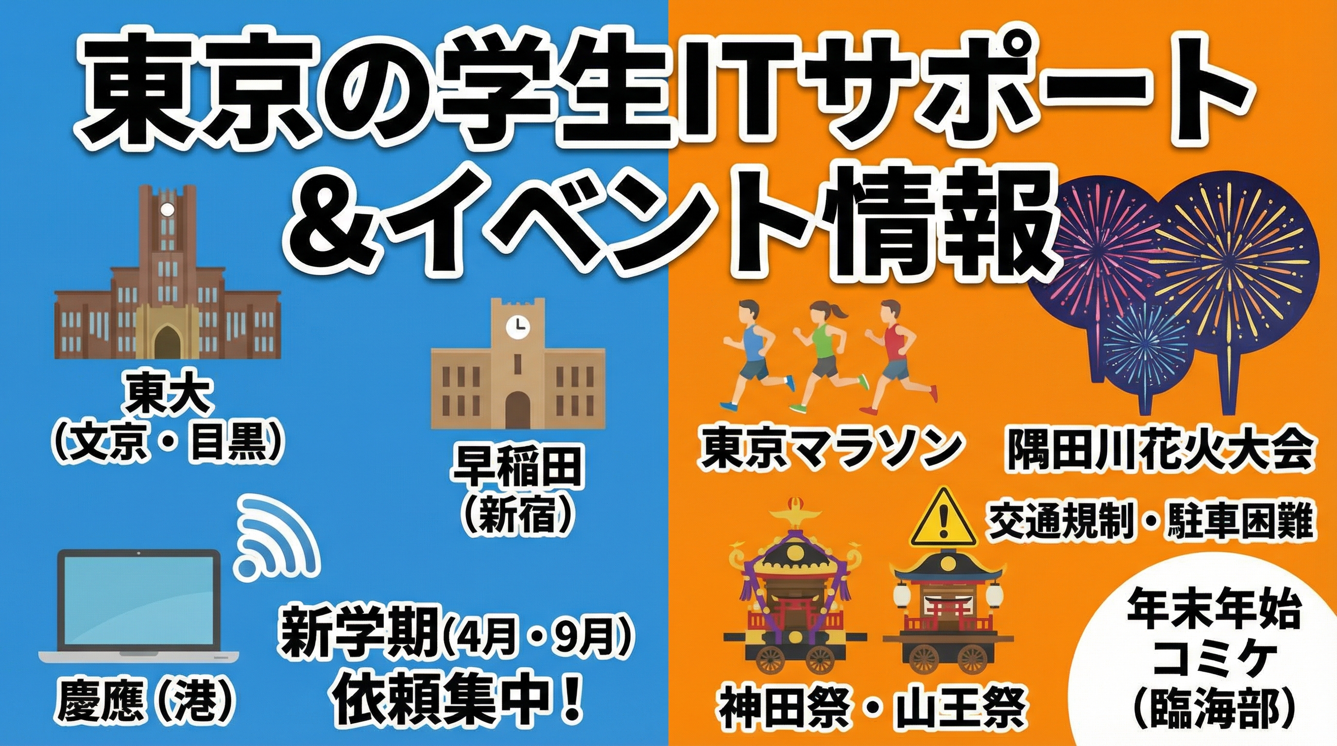教育面では、東京大学(文京区・目黒区)、早稲田大学(新宿区)、慶應義塾大学(港区)など多数の大学が所在し、学生・教職員からのパソコン初期設定、Wi-Fi接続、レポート作成環境構築の依頼が年間を通じて多数あります。特に新学期(4月・9月)は依頼が集中します。