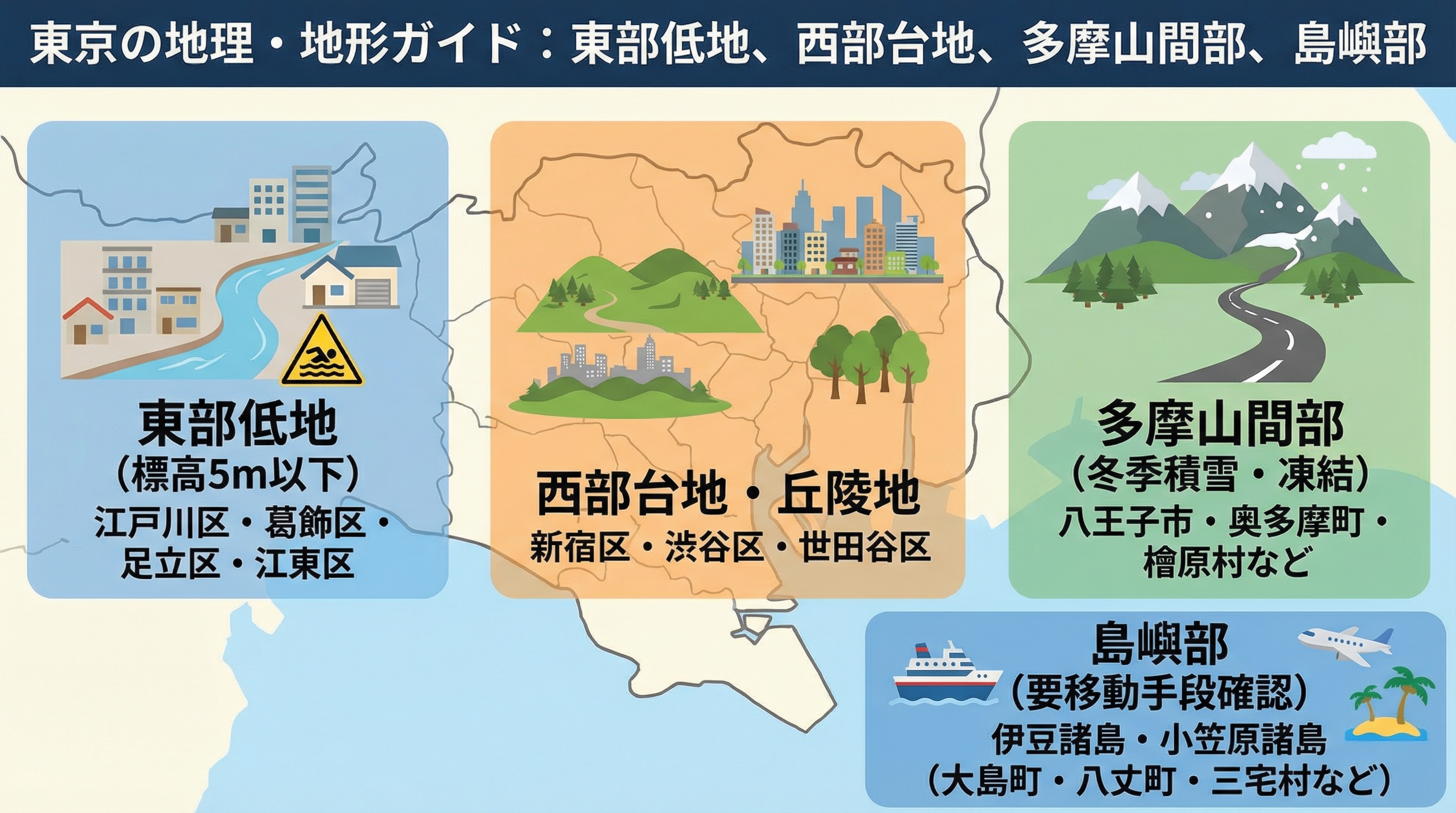 地形面では、23区の東部(江戸川区・葛飾区・足立区・江東区)は標高5メートル以下の低地が広がり、西部(新宿区・渋谷区・世田谷区)は台地・丘陵地となっています。多摩地域では、八王子市・あきる野市・青梅市などの西部山間部があり、奥多摩町や檜原村では冬季に積雪や凍結が発生することがあります。また、伊豆諸島(大島町・八丈町・三宅村など)や小笠原諸島への訪問は、船舶・航空便の利用が必要で、事前に移動手段と所要時間の確認が必須です。