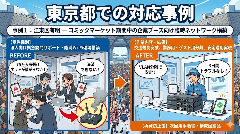【原因特定】8月中旬のコミックマーケット(東京ビッグサイト)期間中、企業ブースでクレジット決済端末とタブレットPOSを使用するため、約75万人の来場者に対応できる安定したWi-Fi環境が必要。既存ルーターでは帯域不足とセキュリティ分離ができず、業務用ネットワークと混在していた