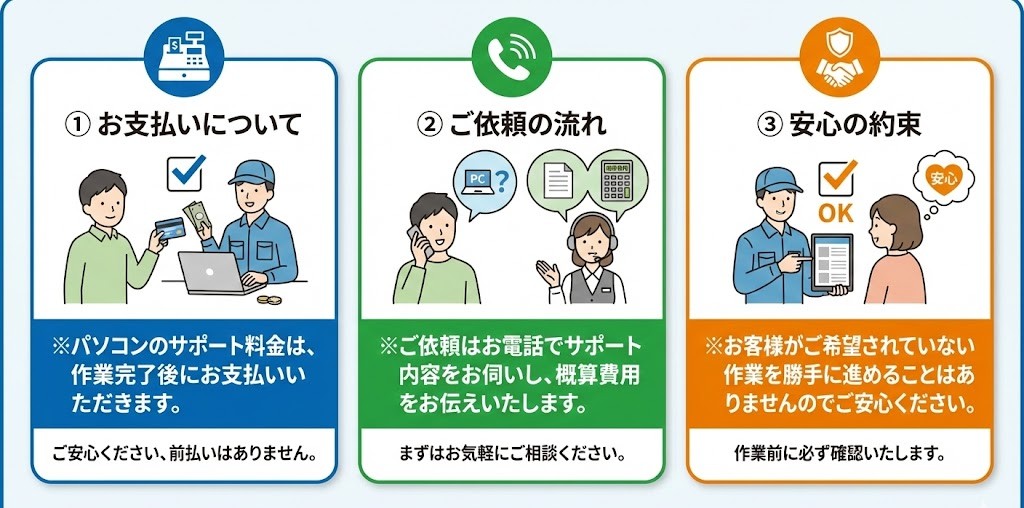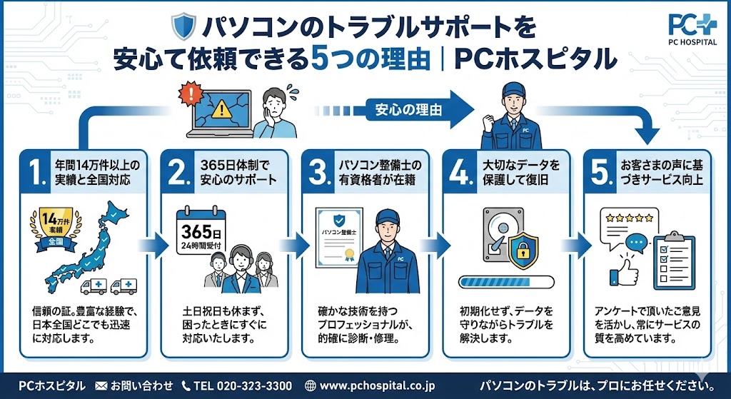 詳しくは「パソコンのトラブルサポートを安心して依頼できる5つの理由」をご覧ください。